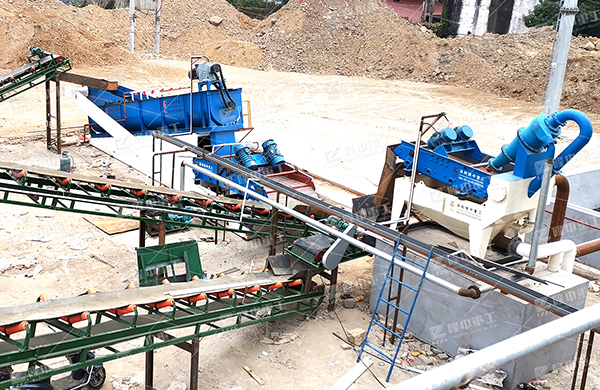 1、如用戶洗選的全是砂子而沒(méi)有石子的話,生產(chǎn)線的配置如下:料倉(cāng)——輸送帶——洗砂機(jī)——輸送機(jī)。